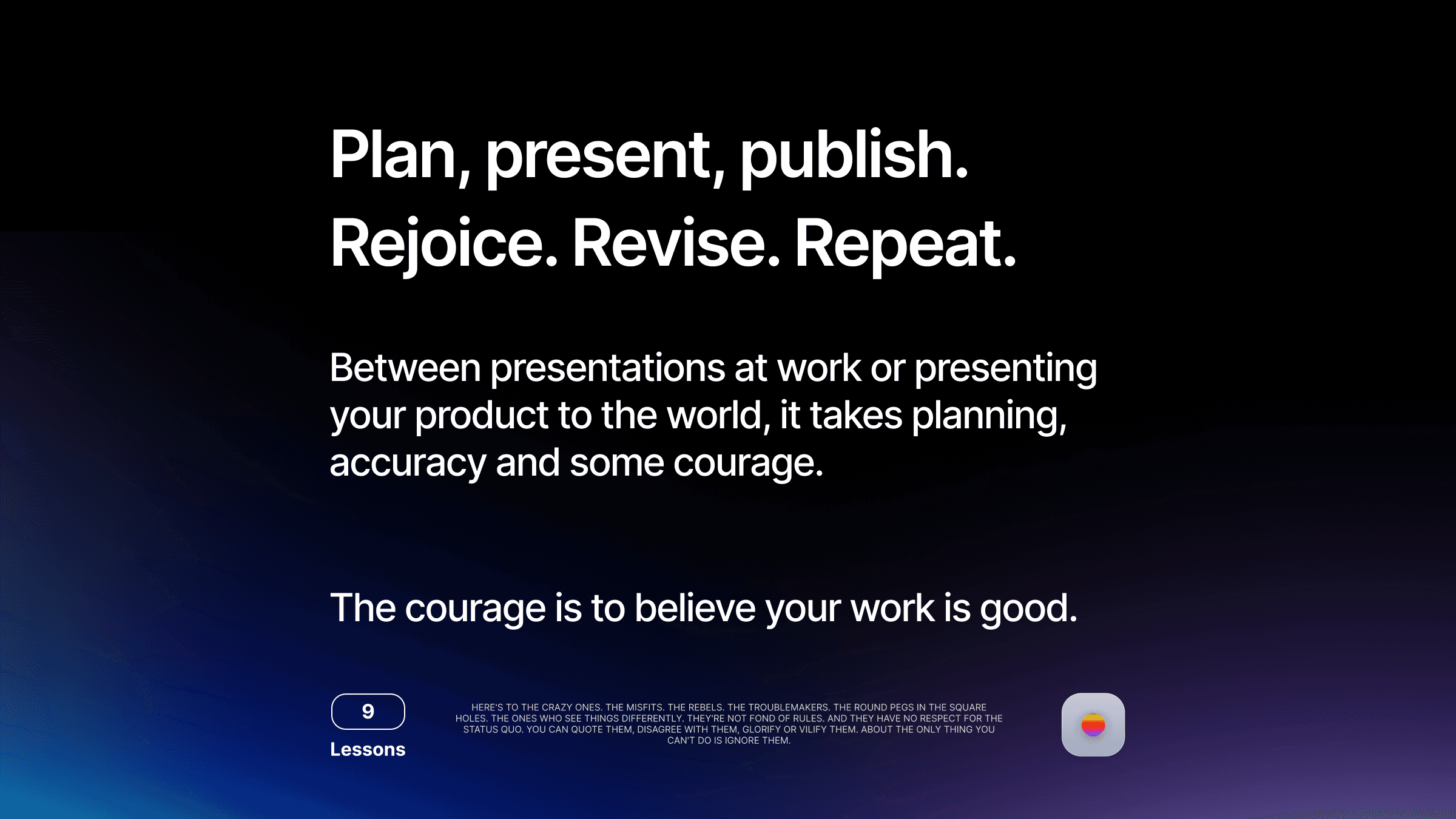 Learn about prioritizing deliverables, taking detailed notes, being prepared, sharing your work ahead of schedule with directors and peers. 9 Lessons covers how to plan, prep and present your work or product from Apple experiences.