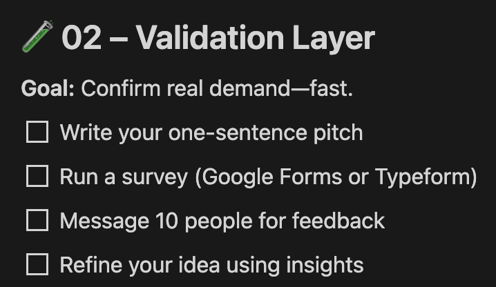 Quickly test your idea with real people so you can build with confidence, not guesswork. Using fast feedback scripts, outreach prompts, and a simple scoring system, you’ll know within hours if your product has real demand and real potential.